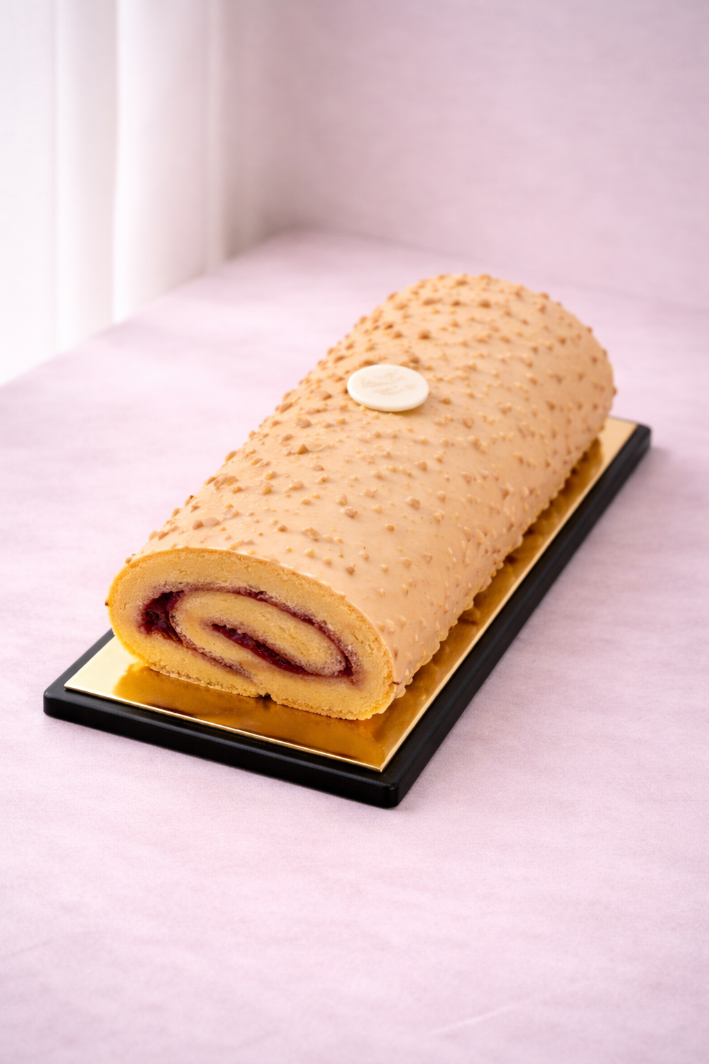 Roulé façon Pims choco blanc noisette, cœur coulis de framboise.